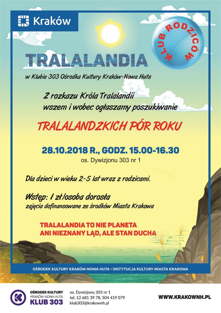 Klub 303 Orodka Kultury Kraków-Nowa Huta (os. Dywizjonu 303 nr 1) zaprasza 28 padziernika w godz. 15.00-16.30 na kolejne spotkanie z Tralalandiš. Czy w Tralalandii zmieniajš się pory roku? Jaka teraz w tej tajemniczej krainie jest pora roku i jak się ona nazywa? Czy choć trochę jest podobna do naszej jesieni? Podczas kolejnego spotkania z Tralalandiš będziemy poznawać tralalandzkie pory roku. Spróbujemy je narysować, namalować lub wykleić na wielkich planszach. Jeżeli chcecie dołšczyć do grona badaczy tralalandzkiej przyrody przyniecie ze sobš materiały i narzędzia, które uznacie za przydatne w tworzeniu plansz. Do zobaczenia w Tralalandii.