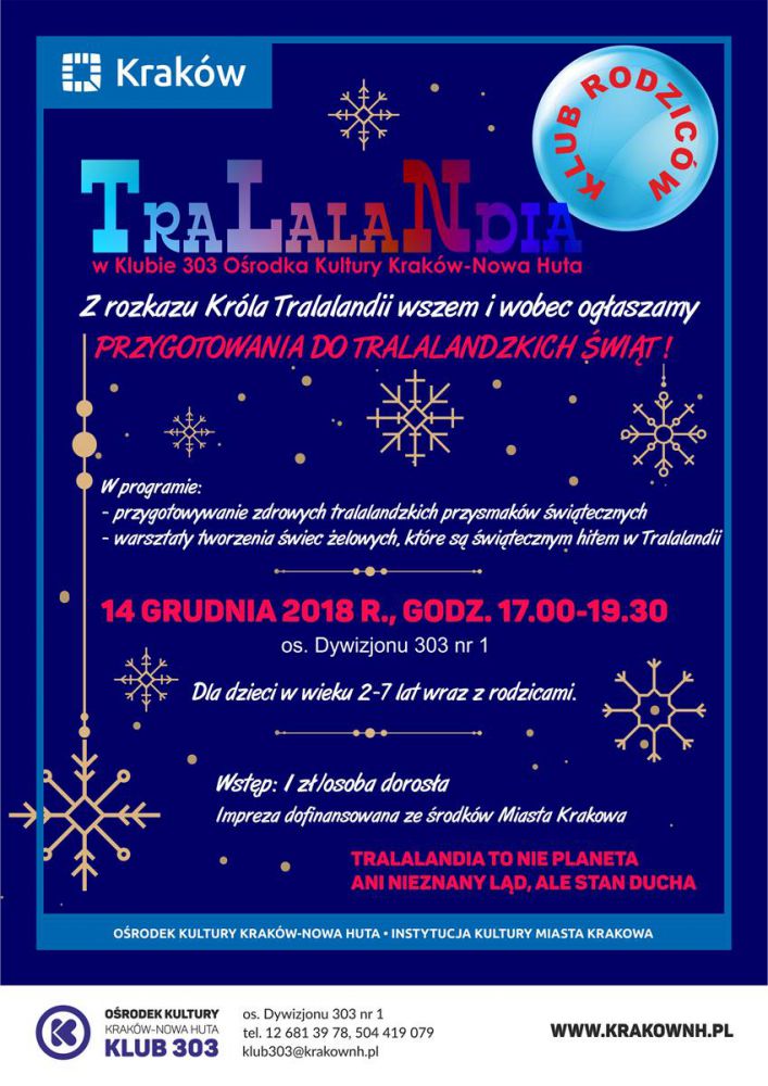 Klub 303 Orodka Kultury Kraków-Nowa Huta (os. Dywizjonu 303 nr 1) zaprasza 14 grudnia w godz. 17.00-19.30 na ostatnie już spotkanie z Tralalandiš. Jego tematem będš tralalandzkie więta. Uczestnicy dowiedzš się czy w Tralalandii obchodzi się więta, jak one wyglšdajš, czy rodowity Tralalandczyk ubiera choinkę i czeka na Mikołaja? Bo kto wie - może w Tralalandii ubiera się drzewka figowe, a prezenty rozdaje Tralalandzki Paw co musi wypić sto kaw? A w programie między innymi warsztaty przygotowania zdrowych przekšsek wištecznych według tajnego przepisu królewskiego kucharza oraz wykonywania wiec żelowych, które podobno sš hitem w tralalandzkim okresie wištecznym.