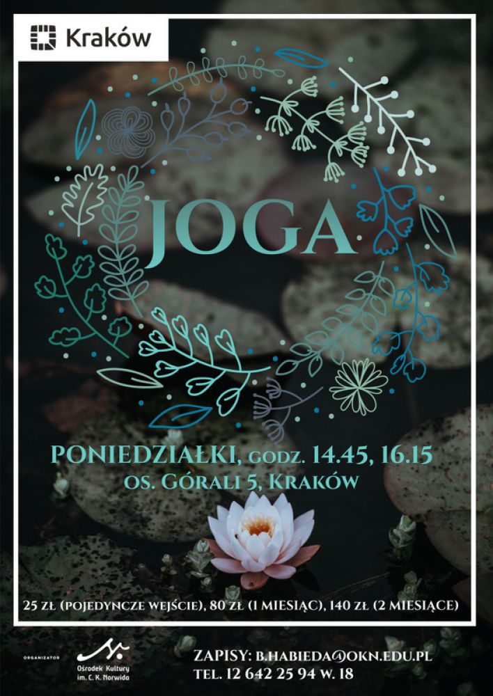 Joga znaczy połšczenie ciała i umysłu. To system ćwiczeń / asan uruchamiajšcy każdy układ w ciele włšczajšc układ hormonalny. Efektem ubocznym praktykowania jogi sš m.in.: dobre samopoczucie, poprawa kondycji psychofizycznej, polepszenie zdrowia, zadowolenie, elastycznoć w ciele i umyle. Program warsztatów jogi w Orodku Kultury Norwida obejmuje grupę ćwiczeń relaksacyjno-rehabilitacyjnych w oparciu o metodę Iyengara. Zajęcia odbywajš się pod okiem dowiadczonej nauczycielki Kamili Berny.