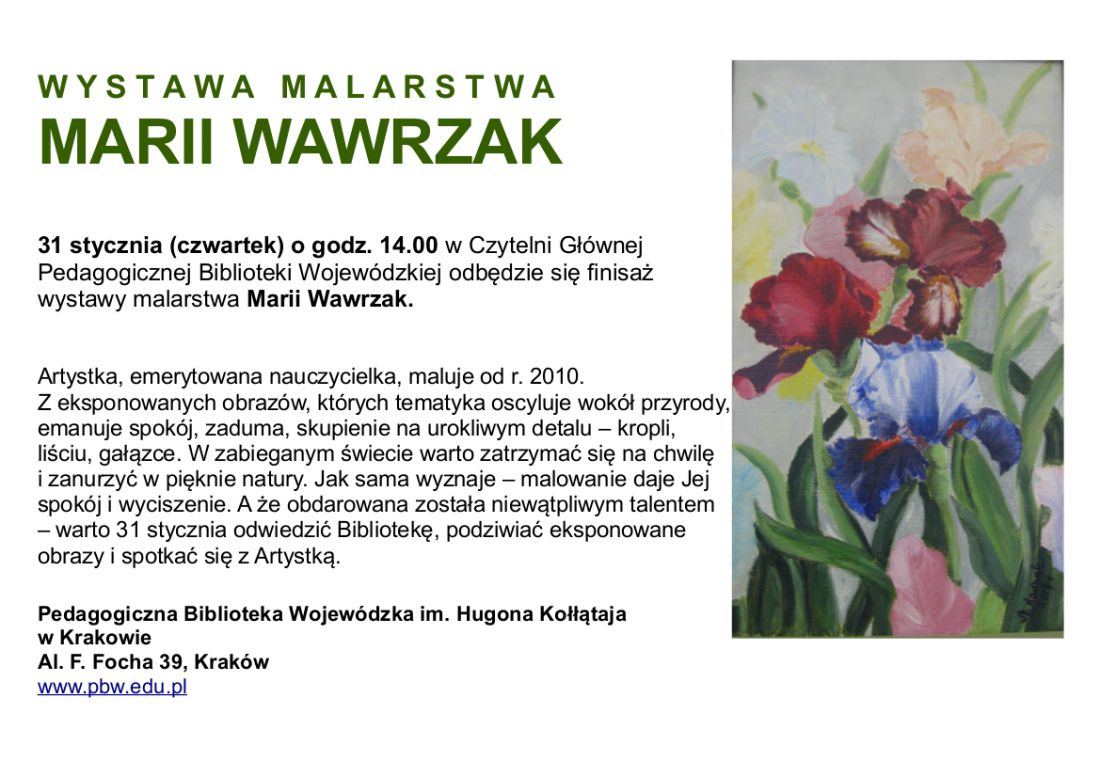 31 stycznia o godz. 14.00 w Czytelni Głównej Pedagogicznej Biblioteki Wojewódzkiej w Krakowie odbędzie się finisaż wystawy malarstwa Marii Wawrzak.