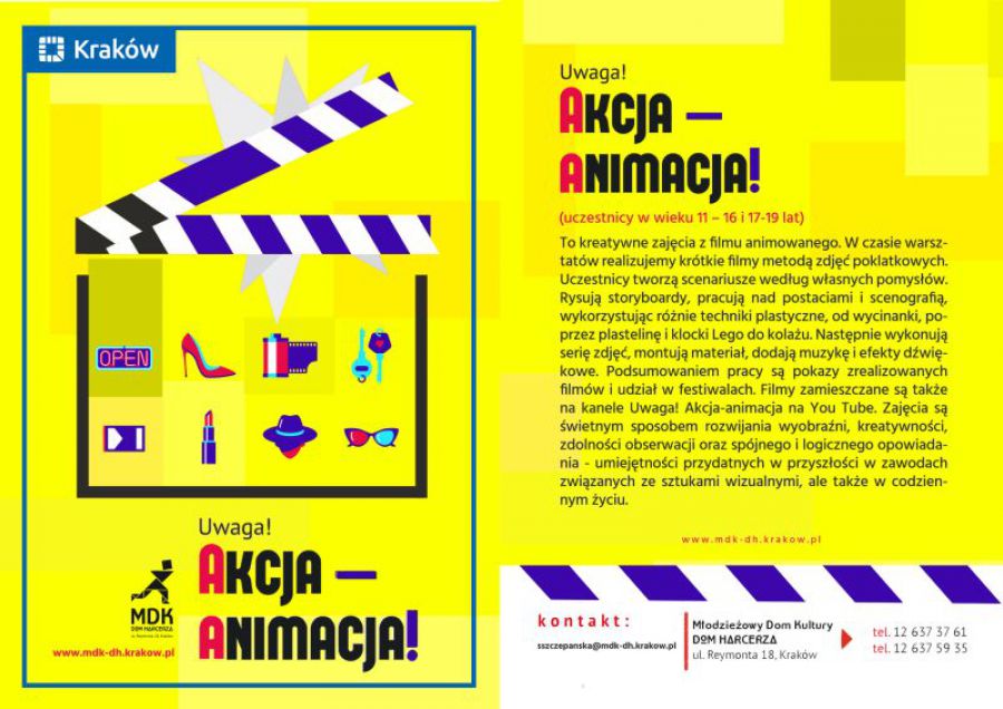 To kreatywne zajęcia z filmu animowanego tradycyjnš metodš zdjęć poklatkowych. Uczestnicy tworzš własne scenariusze, rysujš storyboardy, wykonujš elementy scenografii, bohaterów. Wykorzystujš różne techniki plastyczne, od wycinanki, poprzez plastelinę, kolaż, pikselację.