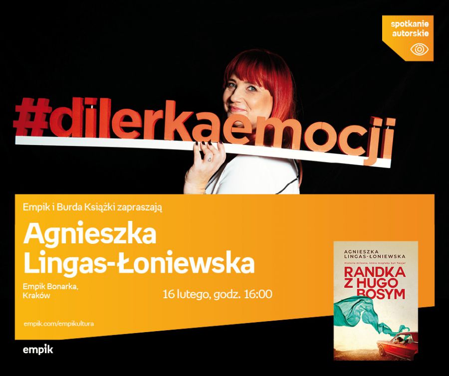 Agnieszka Lingas-Łoniewska to wrocławska pisarka zwana przez swoich czytelników Dilerkš Emocji. Autorka ponad 30 bestsellerowych powieci stanowišcych połšczenie romansu, dramatu i sensacji. Kocha zwierzęta, ma cztery koty i psa. W wolnym czasie, kiedy nie pisze, kocha czytać i oglšdać seriale kryminalne. Jej pasjš sš także nordic walking i robótki ręczne. Do Krakowa przyjedzie w zwišzku z premierš swojej najnowszej powieci Randka z Hugo Bosym (Burda Ksišżki). Jest to opowieć o Jagodzie Borówko majšcej talent do pakowania się w kłopoty. Najnowszym z nich jest Hugo Bosy charyzmatyczny nieznajomy z wesela jej przyjaciółki, z którym flirtowała, a teraz będzie musiała pracować z nim nad jednym z najważniejszych projektów realizowanych przez agencję reklamowš, w której pracuje. Choć oboje starajš się być profesjonalni, nie jest im łatwo oprzeć się wzajemnemu przycišganiu