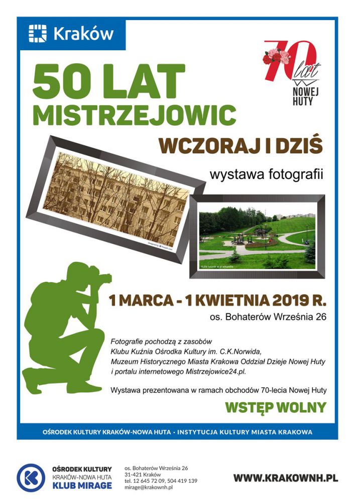 Prezentowane fotografie pochodzš z zasobów Klubu Kunia Orodka Kultury im. Norwida, Muzeum Historycznego Miasta Krakowa Oddział Dzieje Nowej Huty i portalu internetowego Mistrzejowice24.pl. Wystawę, zorganizowanš w Klubie Mirage Orodka Kultury Kraków-Nowa Huta (os. Bohaterów Wrzenia 26) z okazji obchodów 70-lecia powstania Nowej Huty, zwiedzać można przez cały marzec w godzinach otwarcia klubu.