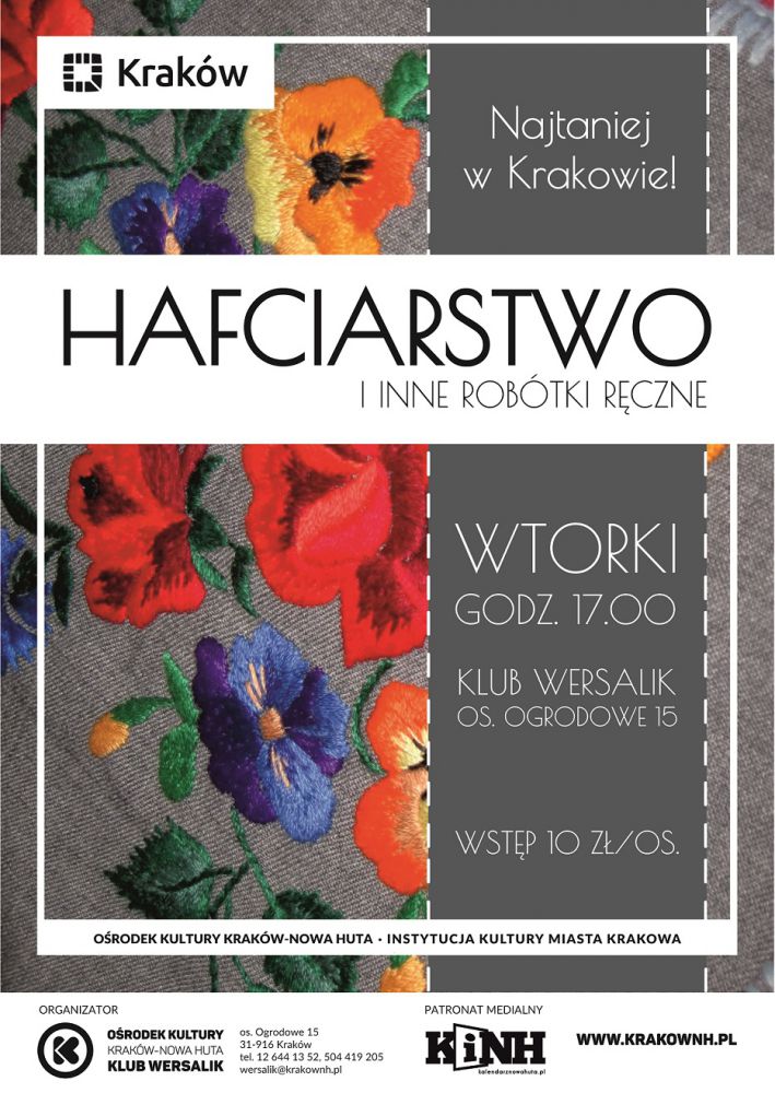 Hafciarstwo czy szydełkowanie to ulubione zajęcia naszych prababć zajęcia, które miały już odejć do lamusa zastšpione przez rozrywki ery cyfrowej, tymczasem za sprawš wyobrani kolejnych pokoleń zyskujš nowe życie. Klub Wersalik Orodka Kultury Kraków-Nowa Huta (os. Ogrodowe 15) zaprasza na warsztaty haftu ręcznego oraz innych robótek ręcznych. Nasze warsztaty to okazja do wymiany dowiadczeń i inspiracji dla tych, którzy na przegryzaniu nici dawno zjedli zęby. Dla poczštkujšcych i osób, które dopiero pragnš poznać warsztat hafciarski, szydełkowanie czy robótki na drutach - szansa na poznanie prawdziwych pasjonatów rękodzieła, zdobycie wiedzy i dowiadczenia, a przede wszystkim życzliwego wsparcia bardziej dowiadczonych hobbystów.