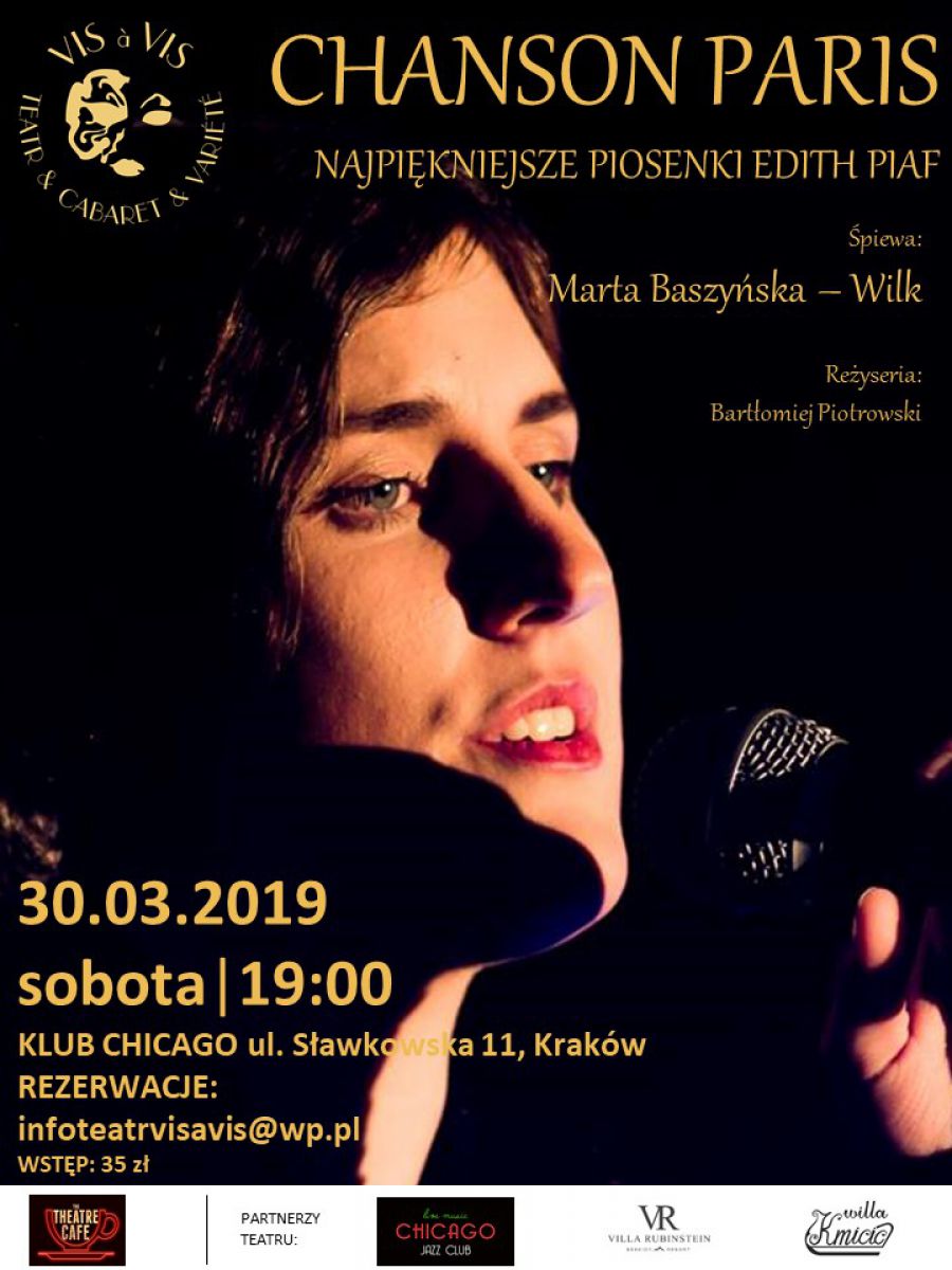 W wyjštkowym programie CHANSON PARIS - najpiękniejsze piosenki Edith Piaf, francuskie szlagiery oraz przeboje Ewy Demarczyk, a także wiersze Jacquesa Preverta i Haliny Powiatowskiej - zapiewa dla Państwa Marta Baszyńska - Wilk aktorka scen muzycznych i wokalistka.