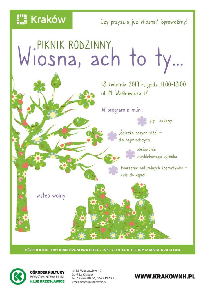 O tej porze roku przyroda zachwyca, zaciekawia i cieszy nasze oczy ekspansjš zieleni. Aż chce się spędzać czas poród natury. Dlatego Klub Krzesławice Orodka Kultury Kraków-Nowa Huta (ul. M. Wańkowicza 17) zaprasza 13 kwietnia od godz. 11.00 na piknik Wiosna, ach to ty. Urzšdzimy cieżkę bosych stóp dla najmłodszych, zorganizujemy liczne gry i zabawy, zajmiemy się przygotowaniem naturalnych kosmetyków. Wspólnymi siłami urzšdzimy kwietny ogródek wokół Klubu, by słoneczniki, maciejka, bratki i łubin cieszyły oczy aż do jesieni i napawały dumš tych, którzy je zasiali.