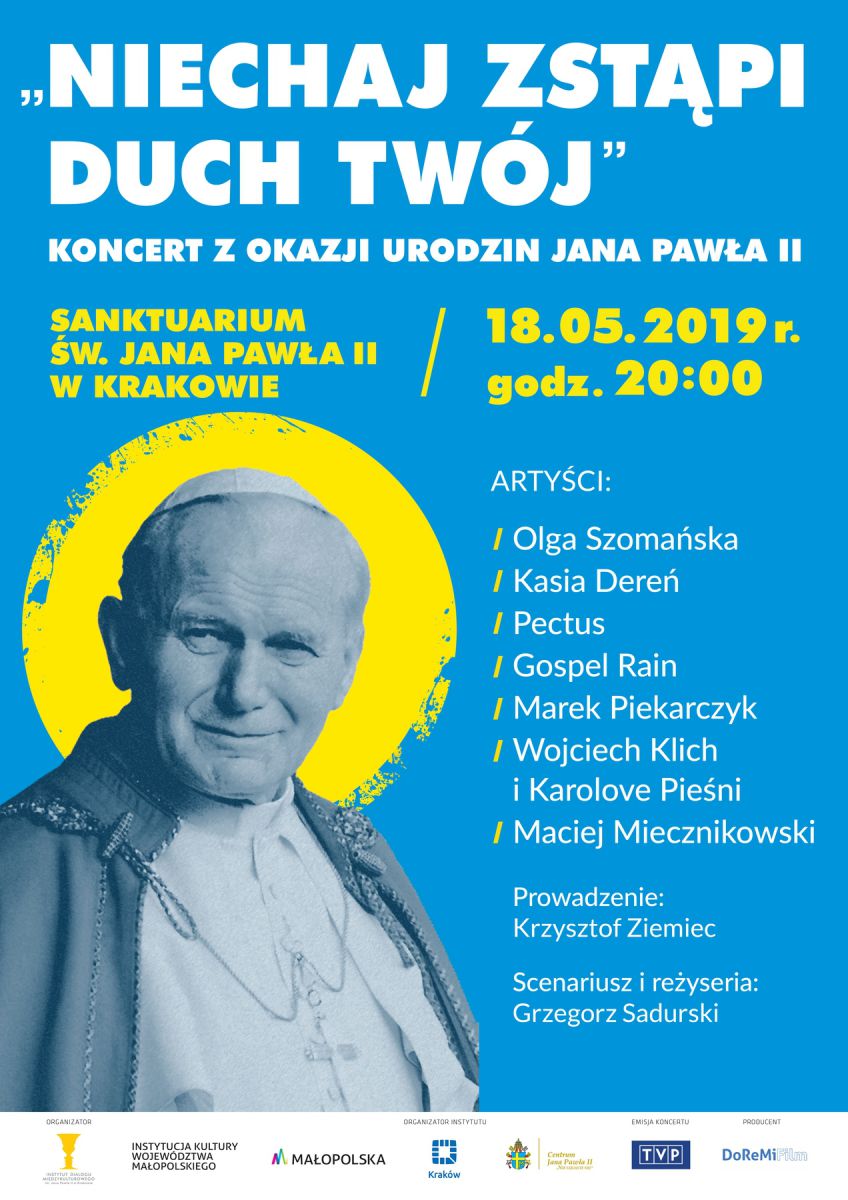 Już w najbliższš sobotę, 18 maja 2019 roku o godzinie 20:00 w Sanktuarium œw. Jana Pawła II w Krakowie odbędzie się koncert pt. „Niechaj zstšpi duch Twój” organizowany z okazji urodzin papieża Polaka. Wstęp na wydarzenie jest wolny.