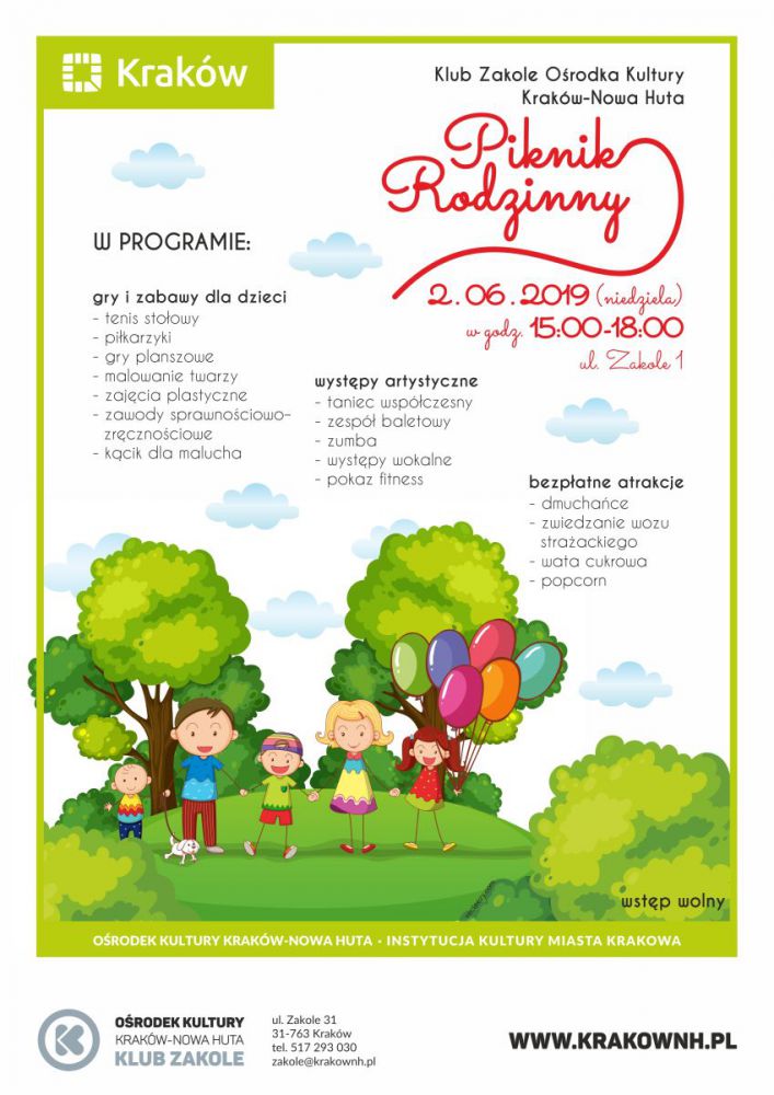 Klub Zakole Oœrodka Kultury Kraków-Nowa Huta (ul. Zakole 31) zaprasza 2 czerwca w godz. 15.00-18.00 mieszkańców Kantorowic i okolicznych osiedli na Piknik Rodzinny. Niedzielne popołudnie pod gołym niebem umilš występy artystyczne, zabawy animacyjne oraz konkursy z nagrodami. Najmłodsi uczestnicy imprezy przeniosš się w bajkowy œwiat, w którym szukać będš ukrytego skarbu.