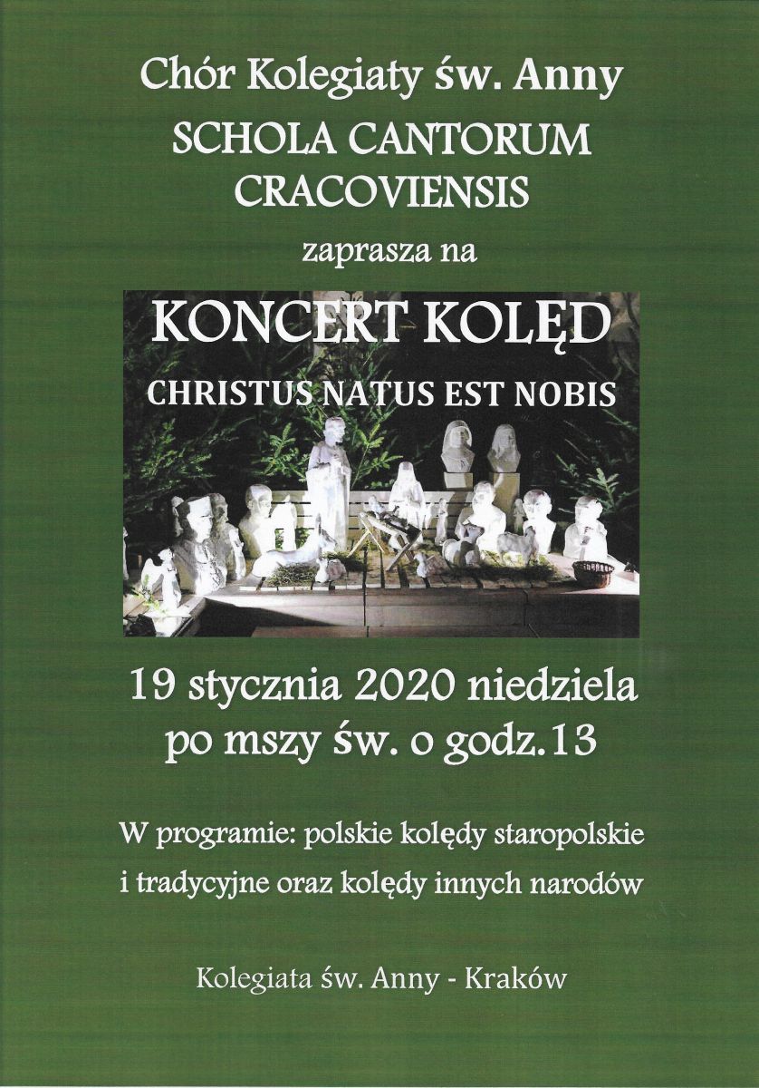 Chór Kolegiaty œw. Anny Schola Cantorum Cracoviensis zaprasza na Koncert Kolęd "Christus natus est nobis". W programie kolędy polskie - dawne i nowe - oraz kolędy innych krajów.