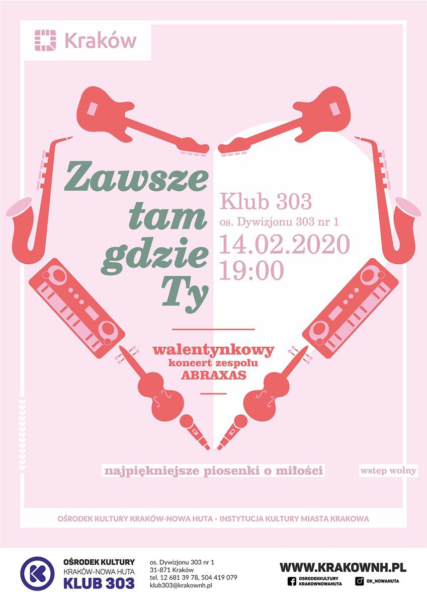 Jedni mówiš o nich wprost. Inni - wyrażajš je poezjš, muzykš, słowami piosenek. Jeszcze inni - prostym życzliwym gestem lub symbolicznym podarunkiem. Sš inspiracjš artystów, muzyków i poetów od zarania dziejów. Mowa oczywicie o uczuciach, które w walentynkowe więto wybrzmiewajš pod przeróżnymi postaciami. W walentynkowy wieczór Klub 303 Orodka Kultury Kraków-Nowa Huta serdecznie zaprasza dorosłych w każdym wieku na spotkanie z najpiękniejszymi piosenkami o miłoci, które wykona zespół ABRAXAS. W pierwszej częci wydarzenia uczestnicy wysłuchajš utworów takich artystów jak Anna Jantar, Andrzej Zaucha, Barbra Streisand czy Stevie Wonder. Po koncercie zaplanowano potańcówkę oczywicie z muzykš na żywo.