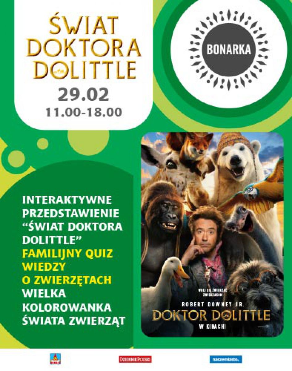 Na co narzekajš lisy i goryle? I o czym tak namiętnie dyskutujš żyrafy? O tym wszystkim wie tylko Doktor Dolittle niezwykły weterynarz, który potrafi rozmawiać ze zwierzętami. W Bonarce zostanie zorganizowana impreza dla dzieci inspirowana motywami z filmu Doktor Dolittle z Robertem Downeyem w roli głównej. Gociem specjalnym będzie sam Doktor Dolittle.