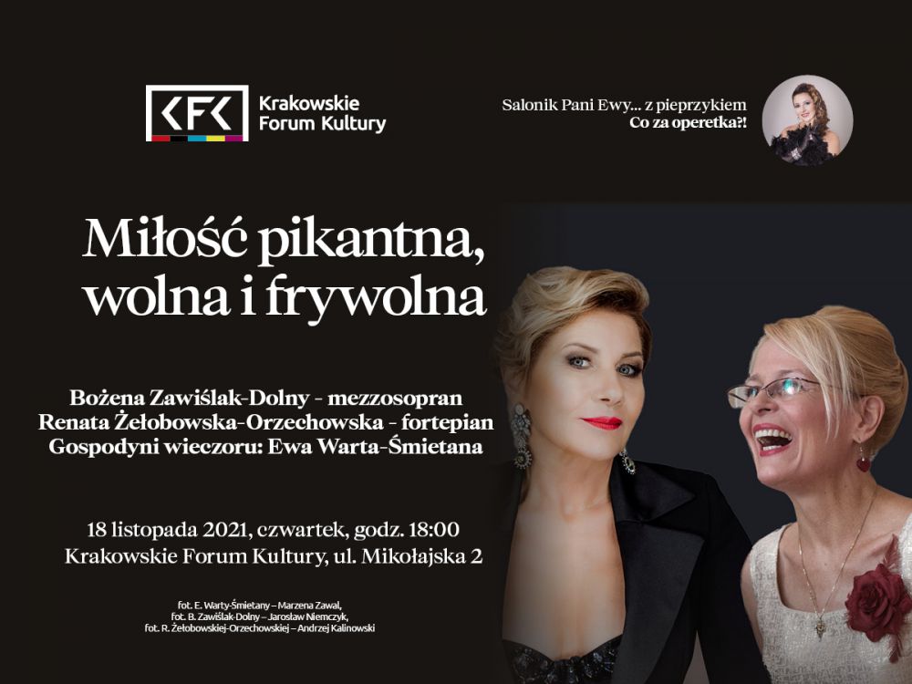 Krakowskie Forum Kultury zaprasza na cykl spotkań z operetkš, prowadzony przez znakomitš sopranistkę Ewę Wartę-mietanę. W ramach cyklu zaproszeni gocie wypełniš wieczór ariami i duetami, które w swych treciach będš odpowiadały tytułom poszczególnych odcinków.