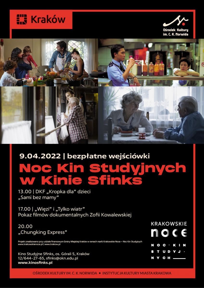 Kino Studyjne Sfinks zaprasza na 3. Noc Kin Studyjnych. W programie pokazy filmów: Sami bez mamy, Tylko wiatr, Więzi, Chungking Express.