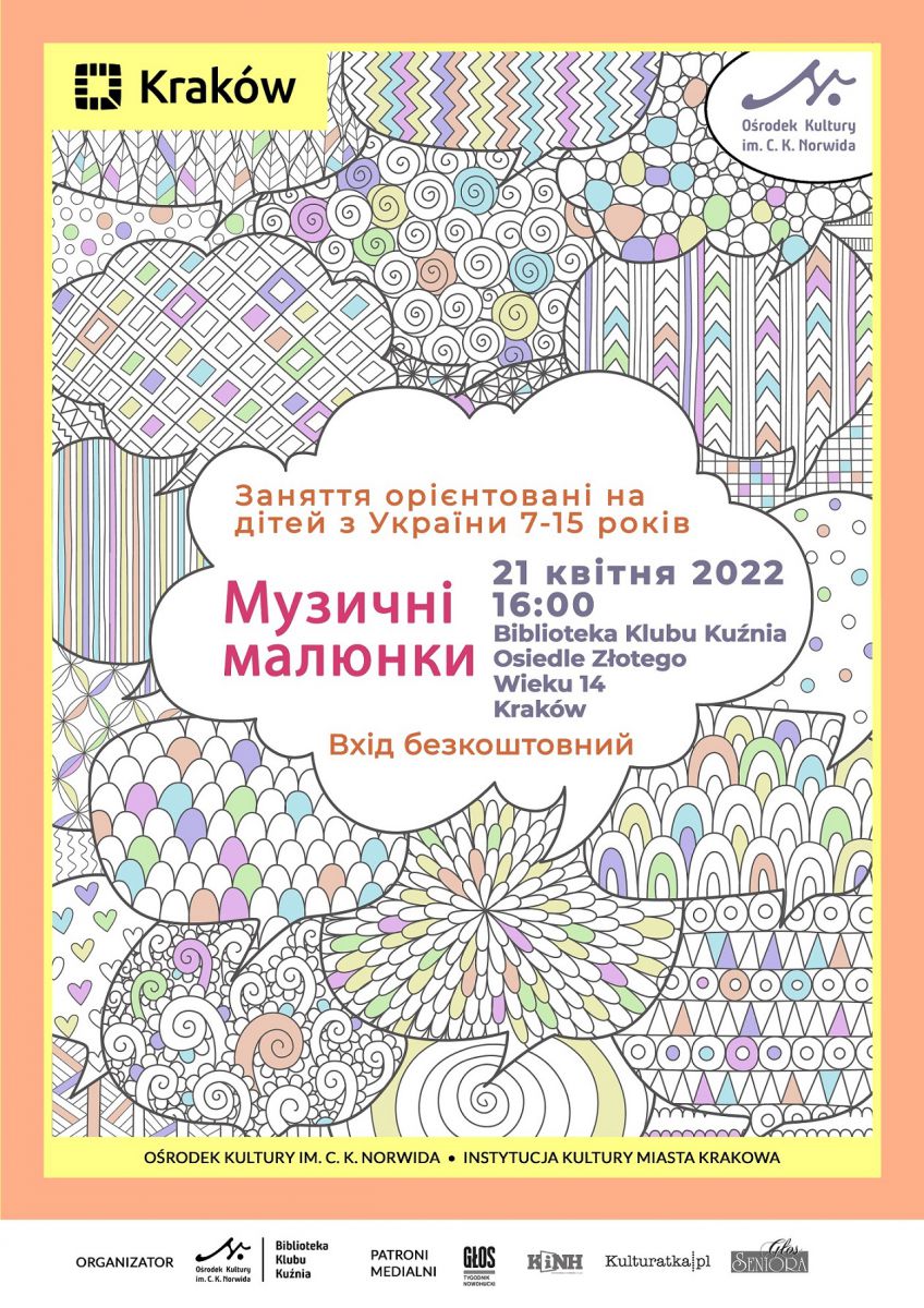 Biblioteka to miejsce pełne słów, człowiek potrafi jednak porozumiewać się również na inne sposoby. DŸwięki i obrazy to nasz uniwersalny język – pozwala przekazać wszelkie emocje i fantazje. A gdyby tak namalować dŸwięki? Na zajęciach w naszej bibliotece, w otoczeniu tysięcy ksišżek, dzieci będš mogły zrelaksować się przy muzyce i za pomocš kredek, pisaków, kolorowych papierów i tkanin, a nawet ziaren czy liœci, wyrazić wszystko, co podpowie serce i wyobraŸnia.