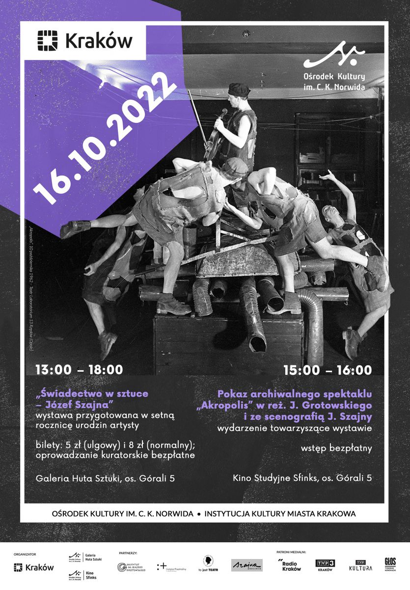 Wystawa „Świadectwo w sztuce – Józef Szajna” została podzielona na trzy części, a prezentowane prace pochodzą z różnych okresów twórczości artysty. W pierwszej koncentrujemy się na obrazach i instalacjach przestrzennych, drugą tworzą projekty scenografii i kilkadziesiąt fotograficznych zapisów z najważniejszych sztuk teatralnych, natomiast trzecią stanowi przestrzeń multimedialna, gdzie zwiedzający obejrzą archiwalne nagranie ostatniego spotkania Józefa Szajny z publicznością, które odbyło się w 2007 roku w Nowej Hucie (w Ośrodku Kultury im. C. K. Norwida). Wystawie towarzyszyć będzie archiwalny pokaz przedstawienia „Akropolis” w reżyserii Jerzego Grotowskiego ze scenografią Józefa Szajny z 1962 roku, który będzie można zobaczyć 16 października 2022 o godz. 15.00 (wstęp bezpłatny) w Kinie Studyjnym Sfinks, będącym częścią Ośrodka Kultury im. C. K. Norwida.