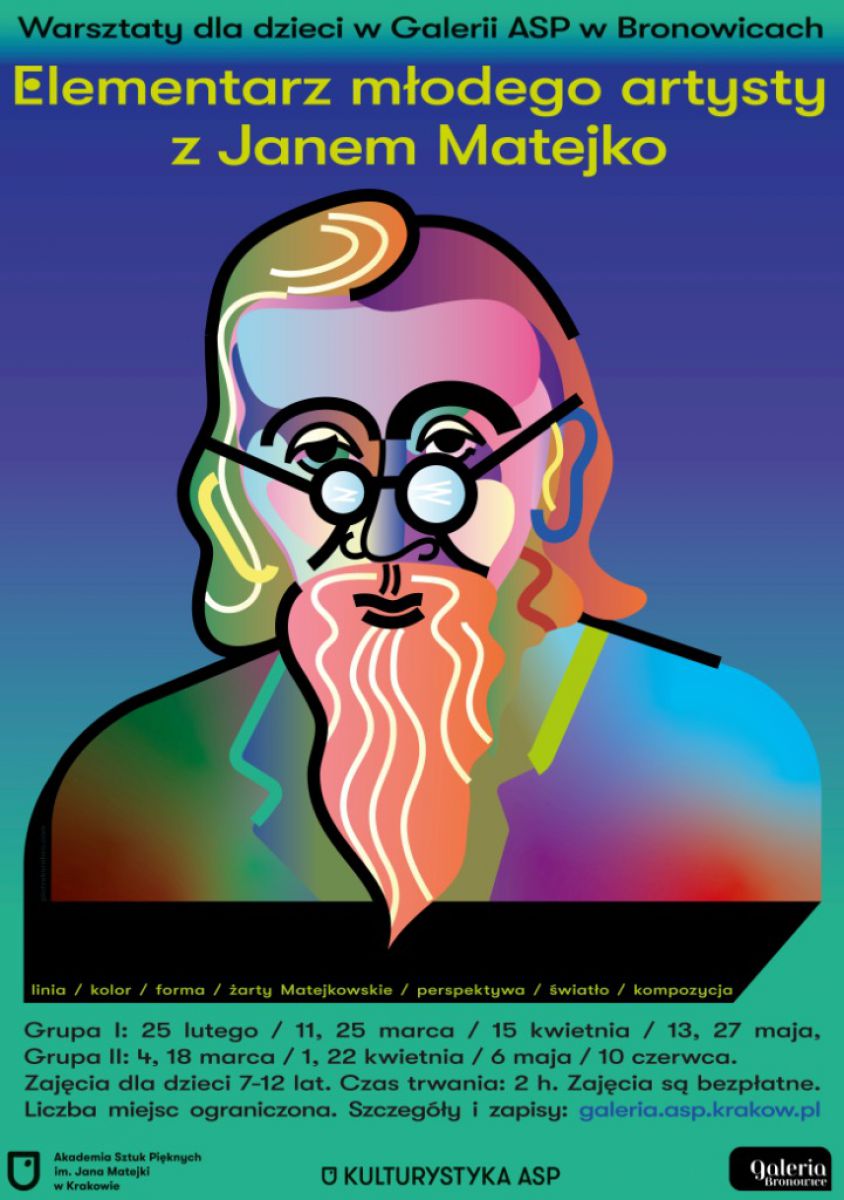 Galeria Bronowice, wspólnie z krakowską ASP, postanowiła zorganizować kolejną edycję kreatywnych warsztatów. Tym razem zajęcia poświęcone będą twórczości Jana Matejki. Pod czujnym okiem dydaktyków z ASP dzieci, w wieku 7-12 lat, będą miały okazję kontynuować zgłębianie podstawowych narzędzi artystycznych, takich jak: linia, kolor, forma, perspektywa, światło czy kompozycja. Zagadnienia te wzbogacone będą o przykłady z dorobku i warsztatu malarskiego oraz rysunkowego Jana Matejki. Warsztaty w formie zabawy i praktycznych ćwiczeń oparte będą na kanwie wątków historycznych, szczególnie ważnych w kontekście nurtu historyzmu w malarstwie polskim. Autorką programu jest dr Izabela Biela. Warsztaty odbędą się w Galerii ASP Bronowice (Galeria Bronowice, ul. Stawowa 61, poziom +1).
