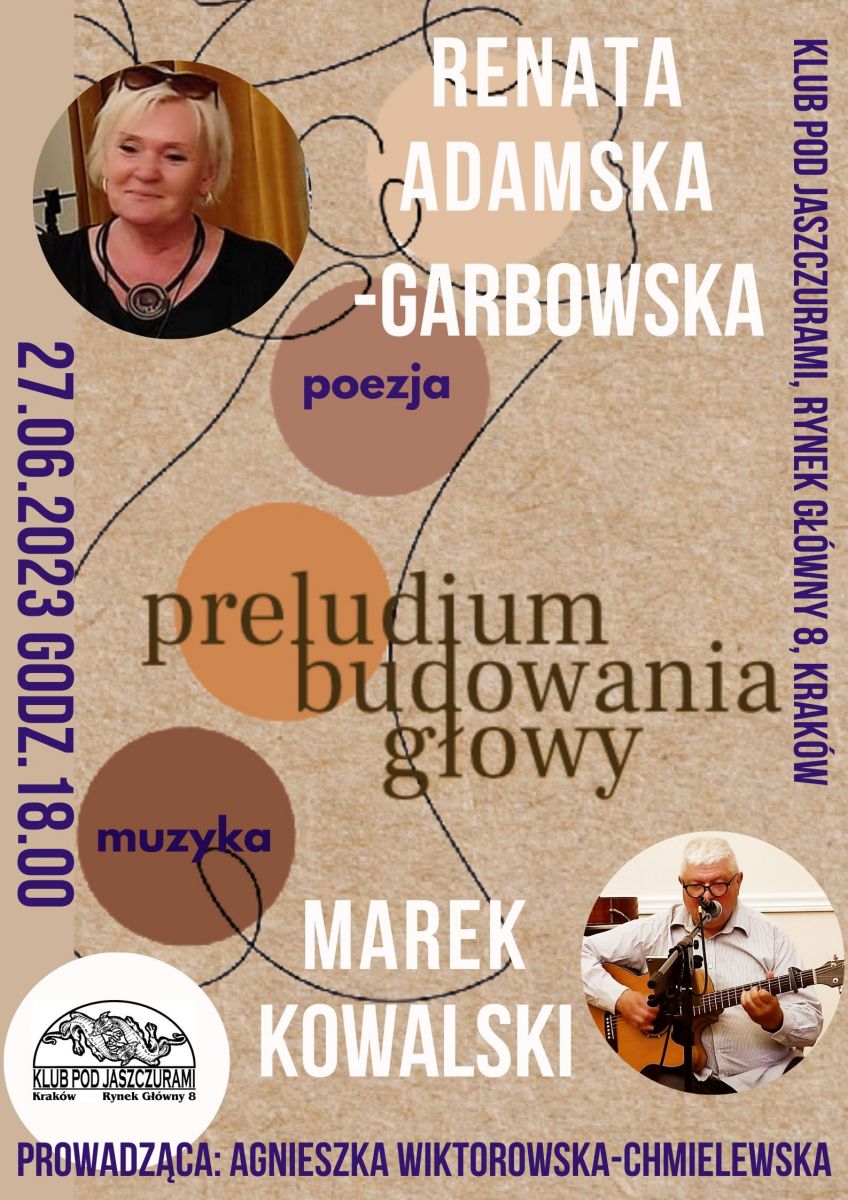 Zapraszamy do Klubu Pod Jaszczurami na promocję najnowszej książki poetyckiej Renaty Adamskiej-Garbowskiej "Preludium budowania głowy" oraz koncert gitarowy Marka Kowalskiego.