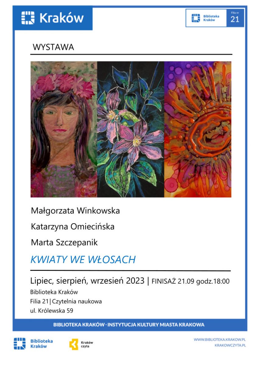 Malarki zapraszają serdecznie do Czytelni Naukowej, ul. Królewska 59, na kolejną wspólną wystawę – „Kwiaty we włosach” od 1.07.2023 – 30.09.2023 oraz na finisaż wystawy 21.09.2023r.