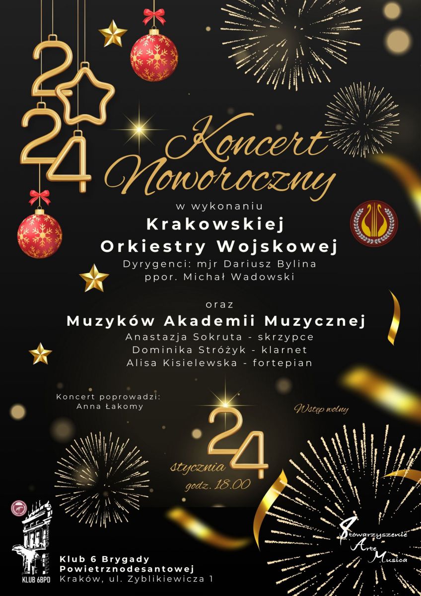 Zapraszamy na Koncert Noworoczny w wykonaniu Orkiestry Wojskowej w Krakowie oraz Muzyków Akademii Muzycznej w Krakowie. Muzycy przygotowali dla Państwa znakomity repertuar.