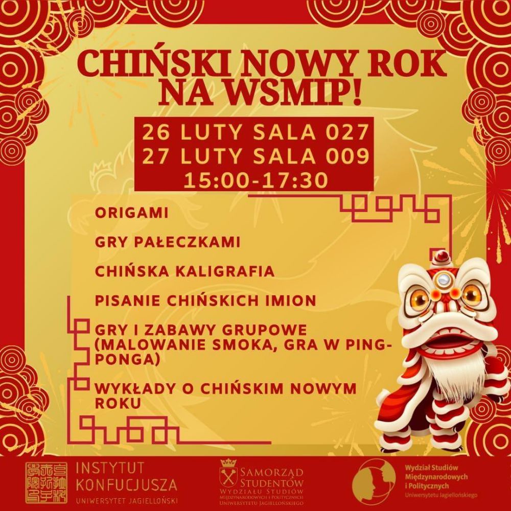 Ośrodek „Instytut Konfucjusza w Krakowie”, Wydział Studiów Międzynarodowych i Politycznych UJ oraz Samorząd Studentów WSMiP UJ serdecznie zapraszają na obchody Chińskiego Nowego Roku w dniach 26-27 lutego.