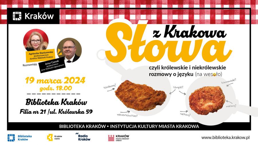 Chcemy poprzyglądać się słowom wędrującym po Krakowie, ale i po innych częściach Polski. Słowom, które w innych regionach mają swoje leksykalne bliźniaki albo wręcz wieloraczki. Kotlet – to po prostu kotlet dla całej polskojęzycznej ludzkości? Oczywiście że nie, większość krakowian teraz szybko odpowie, ale o jaki kotlet chodzi, bo to przecież od tego wszystko zależy! Albo taka zastrugaczka – oj, ta to dopiero ma alternatywną konkurencję! Warto też sobie uzmysłowić, że w wielu (ba! w większości) polskich sypialni nie ma nakastlika, ale jest… no coś tam jest. No i tak się właśnie kręci: fliziarz kładzie kafelki, kafelkarz flizy, to co jedni chcą obejrzeć, inni chcą oglądnąć, jagodzianka jest z borówkami, a w bajce Na jagody nie rośnie ani jedna borówka. Dowodów językowej fantazji zgromadziliśmy wiele i będziemy je radośnie przedstawiać podczas nowej serii spotkań Słowa z Krakowa, czyli królewskie i niekrólewskie rozmowy o języku. Liczymy też na to, że i Państwo rozmowy te wzbogacicie własnymi przykładami! Spotkanie poprowadzą: dr Agnieszka Staniszewska-Mól (językoznawczyni, dyrektorka Biblioteki Kraków) oraz dr Artur Czesak (językoznawca, dialektolog, sympatyk regionalizmów). Wydarzenie organizowane pod patronatem Radia Kraków.