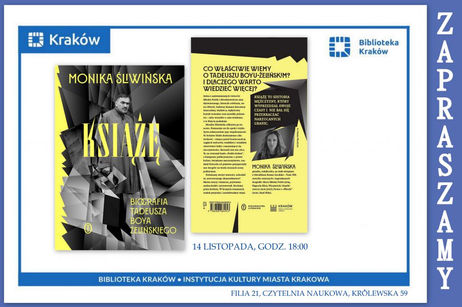 Spotkanie z Moniką Śliwińską – autorką książki Książę. Biografia Tadeusza Boya-Żeleńskiego. Biografia wydana została z okazji 150. rocznicy urodzin krytyka, tłumacza i wydawcy, jednej z ważnych postaci Młodej Polski i dwudziestolecia międzywojennego.