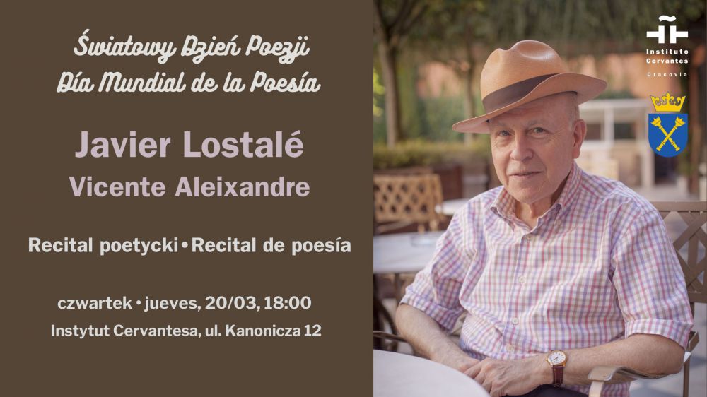 W ramach obchodów Światowego Dnia Poezji, Instytut Cervantesa w Krakowie ma przyjemność zaprosić na recital poezji Javiera Lostalé (Madryt, 1942), hiszpańskiego poety pokolenia lat 70., laureata Narodowej Nagrody za Promocję Czytelnictwa, oraz Vicente Aleixandre (Sewilla, 1898 – Madryt, 1984), laureata Nagrody Nobla w dziedzinie literatury z 1977 roku i przedstawiciela Pokolenia 27. Wydarzenie odbędzie się w czwartek, 20 marca, o godz. 18:00, w siedzibie Instytutu Cervantesa przy ul. Kanoniczej 12.