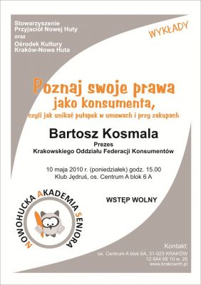 Prawa konsumenta, możliwoœci reklamacji towarów, pułapki w umowach kredytowych i ubezpieczeniowych oraz jak nie dać się oszukać domokršżcom i promocjom – to zagadnienia jakie m.in. zostanš omówione na kolejnym wykładzie w ramach Nowohuckiej Akademii Seniora. Wykład wygłosi Bartosz Kosmala.