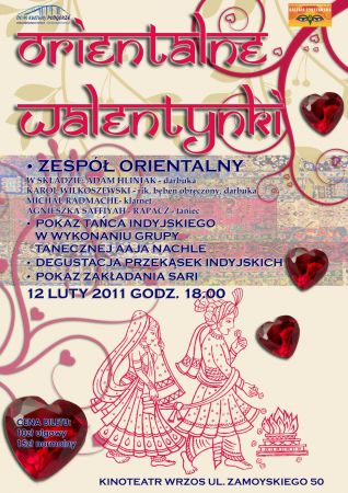 "Orientale Walentynki" to impreza taneczno-kulinarna oparta na motywach bollywoodzkich. W ramach imprezy odbędzie się pokaz tańca, nauka wišzania saree, a także poczęstunek dań indyjskich.