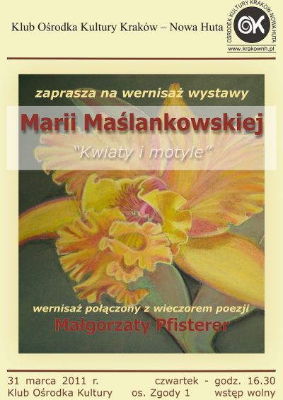 Klub Orodka Kultury Kraków - Nowa Huta zaprasza na wernisaż wystawy Marii Malankowskiej Kwiaty i motyle połšczony z wieczorem poezji Małgorzaty Pfisterer.