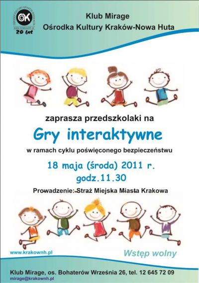 Klub Mirage Orodka Kultury Krakw-Nowa Huta zaprasza na cykliczn imprez dla przedszkolakw, prowadzon przez Jacka Gronowskiego - funkcjonariusza Stray Miejskiej Miasta Krakowa, z zakresu bezpieczestwa i unikania zagroe.
