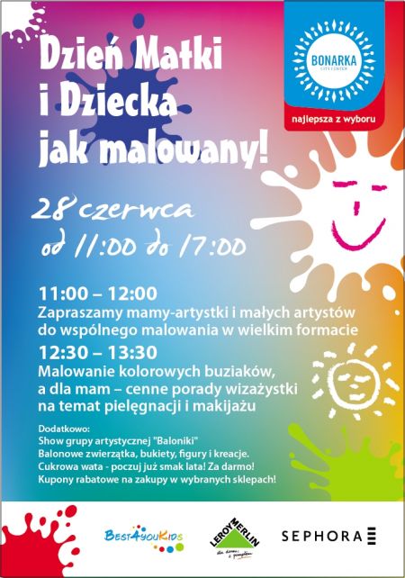 Rodzinne malowanie wielkich płyt i małych dziecięcych buziek, wizaż dla mam, a dla dzieci - wata cukrowa i zamykanie w ogromnych bańkach mydlanych - to tylko niektóre z atrakcji, jakie z okazji Dnia Matki i Dnia Dziecka przygotowała dla klientów Bonarka City Center.