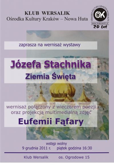 Klub Wersalik Oœrodka Kultury Kraków-Nowa Huta (os. Ogrodowe 15) zaprasza 9 grudnia (pištek) 2011 r. o godz. 16.30 na otwarcie wystawy malarstwa Józefa Stachnika Ziemia Œwięta.