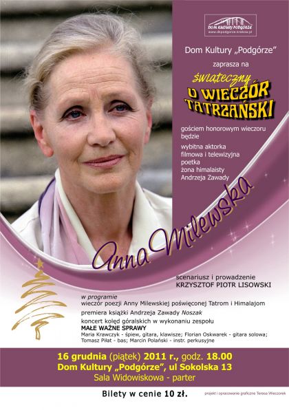 W programie grudniowej odsłony Wieczorów Tatrzańskich Anna Milewska - wybitna aktorka filmowa i telewizyjna oraz poetka zaprezentuje swoje wiersze powięcone tematyce gór - Tatr i Himalajów. Wieczór będzie połšczony z