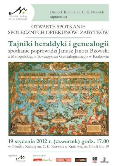 Zapraszamy na otwarte spotkanie miłoœników historii i społecznych opiekunów zabytków poœwięcone tematyce genealogii i heraldyki. Naszym goœciem będzie p. Janusz Janota Bzowski, członek Małopolskiego Towarzystwa Genealogicznego w Krakowie.