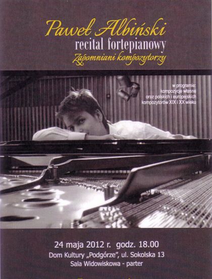 Recital powicony odtworzeniu dzie zapomnianych i nieznanych kompozytorw XIX i XX wieku. W programie utwory fortepianowe cechujce styl muzyki romantyzmu i ekspresjonizmu, ktre w wikszoci w Krakowie nie byy wczeniej wykonywane. Utwory wykona solista Pawe Albiski.