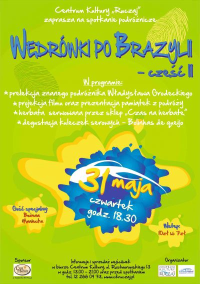 "Wędrówki po Brazylii - częć II" to kolejne spotkanie Klubu Podróżnika w CK "Ruczaj" powięcone Brazylii. Zapraszamy w czwartek, 31 maja o godz. 18:30.
