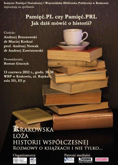 Instytut Pamięci Narodowej oraz Wojewódzka Biblioteka Publiczna w Krakowie zapraszajš na spotkanie Pamięć.pl czy Pamięć.prl? Jak dzi mówić o historii? W dyskusji, którš poprowadzi Roman Graczyk wezmš udział Andrzej Brzozowski, dr Maciej Korkuć, prof. Andrzej Nowak oraz dr Andrzej Zawistowski.