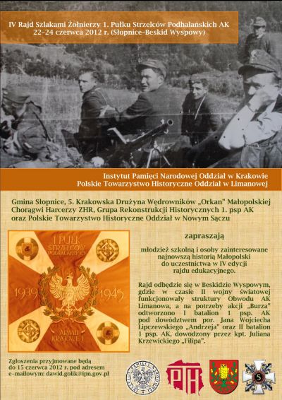 W dniach 2224 czerwca 2012 r. odbędzie się IV edycja rajdu edukacyjnego Szlakami Żołnierzy 1. Pułku Strzelców Podhalańskich AK. Głównymi organizatorami rajdu sš Instytut Pamięci Narodowej Oddział w Krakowie oraz Polskie Towarzystwo Historyczne Oddział w Limanowej. W organizację rajdu włšczyła się również Gmina Słopnice, Małopolska Choršgiew Harcerzy ZHR (5. KDW Orkan), Grupa Rekonstrukcji Historycznych 1. psp AK oraz Polskie Towarzystwo Historyczne Oddział w Nowym Sšczu.