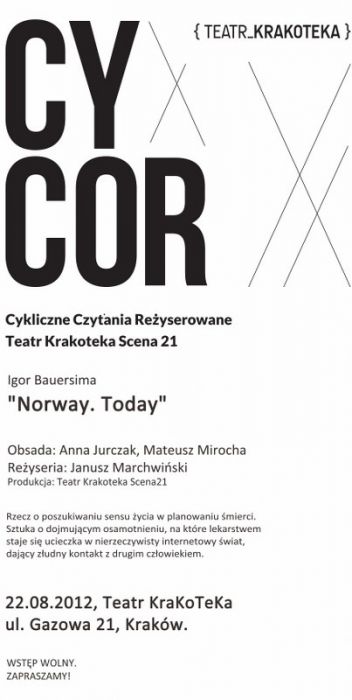 Rzecz o poszukiwaniu sensu życia w planowaniu mierci. Sztuka o dojmujšcym osamotnieniu, na które lekarstwem staje się ucieczka w nierzeczywisty internetowy wiat, dajšcy złudny kontakt z drugim człowiekiem.