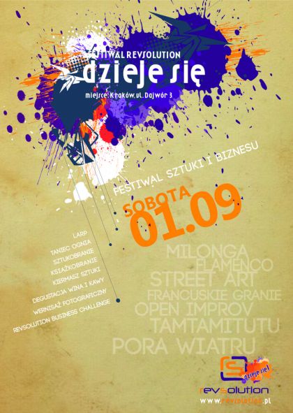 W jednym dniu i w jedno miejsce zapraszamy na debaty powięcone przedsiębiorczoci, biznesowi i sztuce, promocję młodych przedsiębiorców, warsztaty, wernisaż fotografii, targi sztuki (Sztukobranie), kiermasz ksišżek, filmowy ogródek, muzykę na żywo, flamenco i milongę, malarskie jam session, a nawet dla dzieci przedszkole.