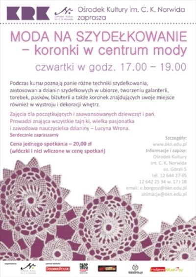 Podczas kursu poznajš panie różne techniki szydełkowania, zastosowania dzianin szydełkowych w ubiorze, tworzeniu galanterii, torebek, pasków, biżuterii a także koronek znajdujšcych swoje miejsce również w wystroju i dekoracji wnętrz.