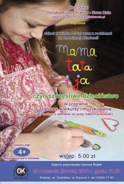Klub Dukat Oœrodka Kultury Kraków-Nowa Huta (ul. Styczna 1) zaprasza 19 wrzeœnia 2012 r. (œroda) o godz. 17.00 na pierwsze po wakacyjnej przerwie spotkanie z cyklu Mama, tata i ja, czyli szczęœliwe dzieciństwo w ramach Rodzinnej Akademii.