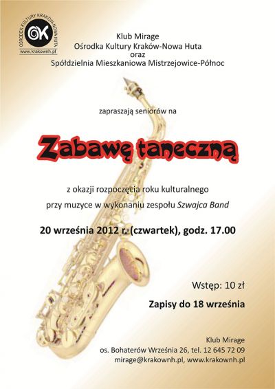 Klub Mirage Oœrodka Kultury Kraków-Nowa Huta (os. Bohaterów Wrzeœnia 26) zaprasza na zabawę tanecznš z okazji Międzynarodowego Dnia Seniora.