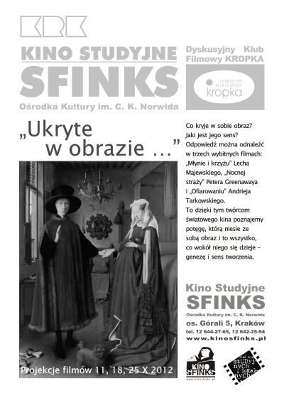 DKF Kropka Kina Studyjnego Sfinks (os. Górali 5) serdecznie zaprasza wszystkich miłoœników kina na paŸdziernikowy przeglšd „Ukryte w obrazie….”, w którym widzowie będš mogli zobaczyć najlepsze filmy o sztuce jakie powstały na przestrzeni ostatnich lat: „Młyn i krzyż” Lecha Majewskiego, „Nocna straż” Petera Greenaway`a i „Ofiarowanie” Andrzeja Tarkowskiego. Każdy z tych filmów ukazuje potęgę, którš niesie ze sobš obraz i to wszystko, co wokół niego się dzieje – genezę i sens tworzenia.