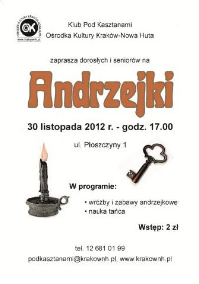 Zabawa andrzejkowa dla dorosłych i seniorów w Klubie Pod Kasztanami Oœrodka Kultury Kraków-Nowa Huta, podczas której nie zabraknie tradycyjnych wróżb. W programie imprezy znajdzie się także nauka tańca.