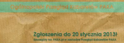 Już niedługo upłynie termin składania zgłoszeń na 29. Przeglšd Kabaretów PAKA, którego finał odbędzie się 24-28 kwietnia 2013r. Poprzedzš go Półfinały w dniach 1-3 marca w Krakowie i eliminacje regionalne 11-17 lutego w Tarnowie, Warszawie i Wrocławiu.