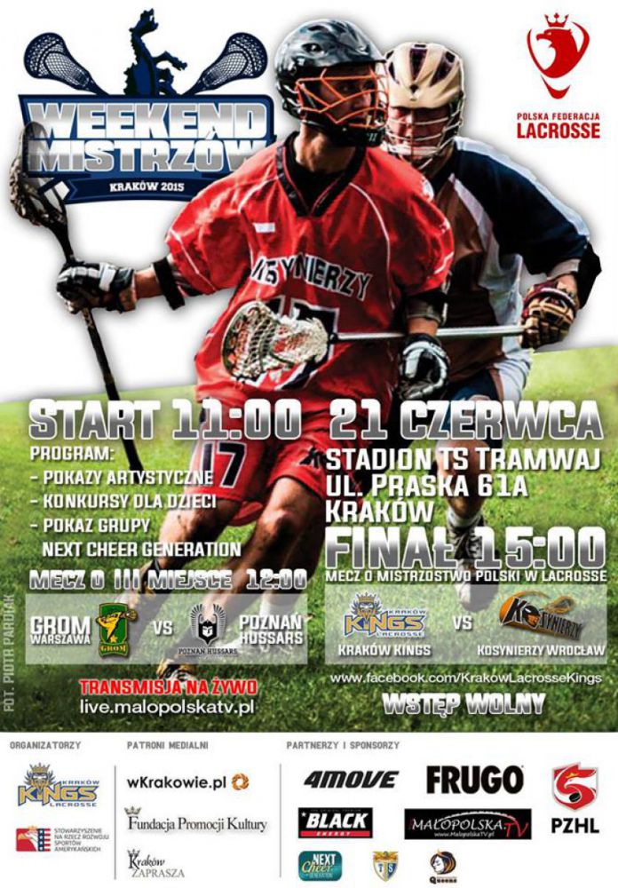 Weekend Mistrzów to największe wydarzenie lacrosse'a w Polsce, kończące zmagania zawodników w sezonie. Cztery najlepsze drużyny z naszego kraju rozgrywają spotkania kolejno o trzecie i pierwsze miejsce - tytuł Mistrza Polski. W tym roku zaszczyt organizacji wydarzenia przypadł dla Kraków Lacrosse Kings, dlatego jest nam niezmiernie miło zaprosić wszystkich chętnych, kibiców, rodziny oraz przyjaciół, na Weekend Mistrzów 2015 - finały Polskiej Ligi Lacrosse, które odbędą się 21 czerwca, na stadionie TS Tramwaj, w Krakowie!