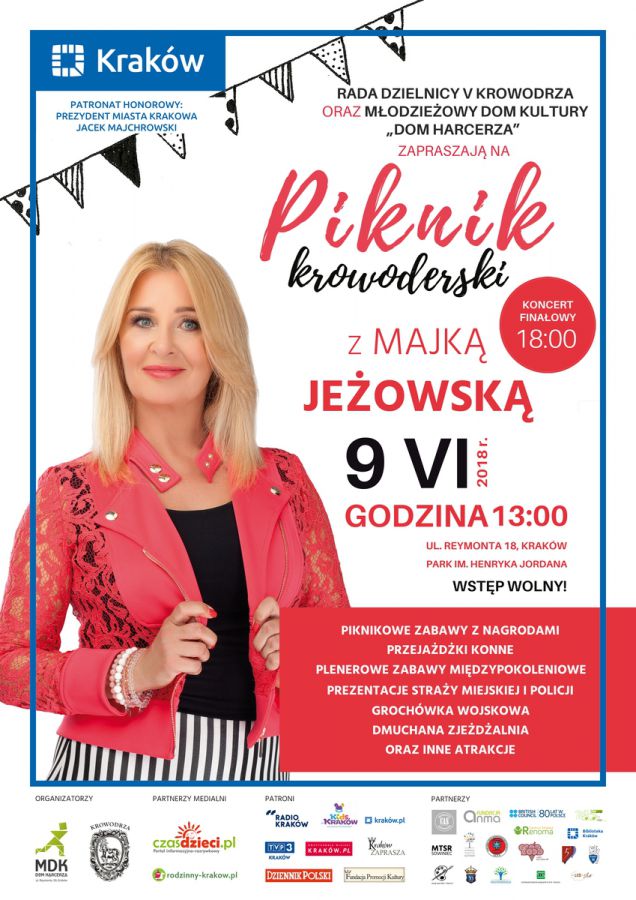 XII edycja „Pikniku Krowoderskiego z Majką Jeżowską” odbędzie się 9 czerwca 2017 roku, na terenie MDK „Dom Harcerza”, ul. Reymonta 18 i części Parku Jordana w godzinach od 13.00 do 19.15.