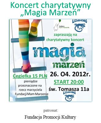Zapraszamy na koncert charytatywny „Magia Marzeń”, który odbędzie się 26 kwietnia 2012 roku w klubie Lizard King w Krakowie, przy ul. Św. Tomasza 11a.
